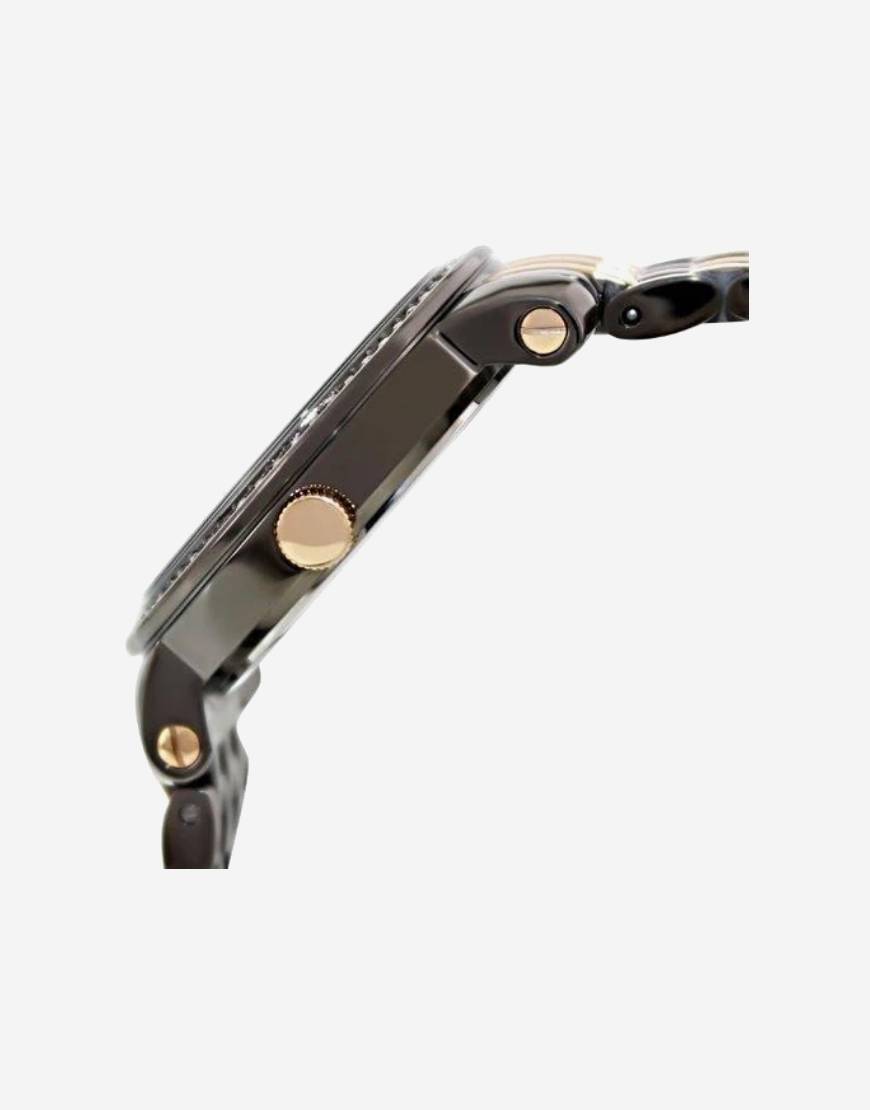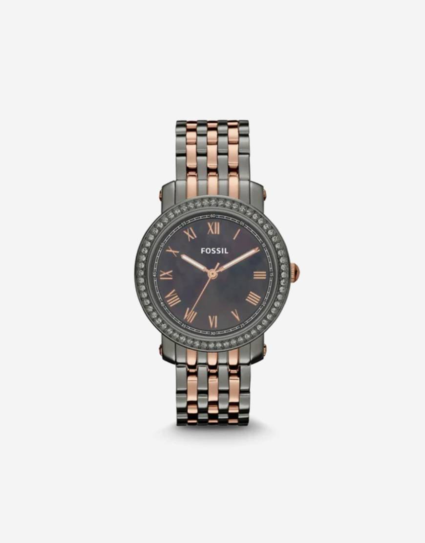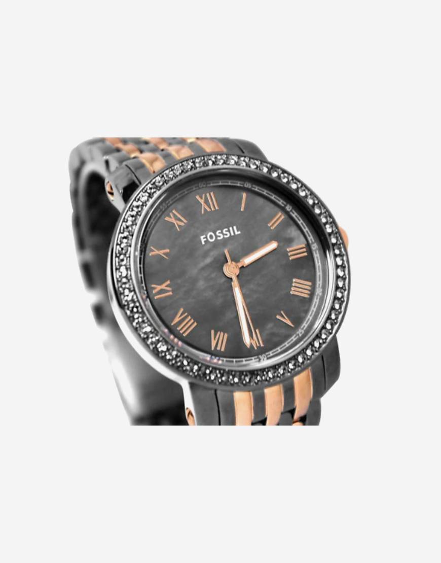 Grey PVD stainless steel case with a two-tone (grey and rose PVD) stainless steel bracelet. Fixed grey PVD bezel set with 60 clear crystals. Dark mother of pearl dial with luminous hands and Roman numeral hour markers. Minute markers around the outer rim. Dial Type: Analog. Luminescent hands and markers. Quartz movement. Scratch resistant mineral crystal. Pull / push crown. Solid case back. Case diameter: 38 mm. Case thickness: 10 mm. Round case shape. Band width: 18 mm. Push button deployment clasp. Water resistant at 50 meters / 165 feet. Functions: hour, minute, second. Dress watch style. Fossil Emma Dark Mother of Pearl Dial Two-tone Ladies Watch ES3115